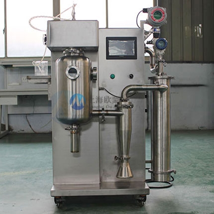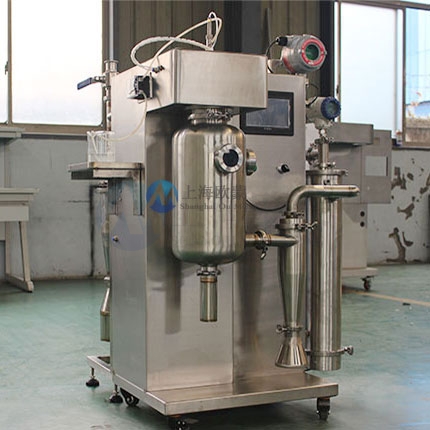 首先在開啟風(fēng)機,加熱模塊,干燥塔體內(nèi)充入氮氣,要被干燥的液態(tài)物料經(jīng)輸液泵輸送至噴頭處,液態(tài)物料被霧化器霧化成細小液滴,液滴在干燥塔內(nèi)與熱氮氣進行充分的熱交換,物料中的液態(tài)部分被瞬間蒸發(fā),固態(tài)部分形成的粉狀物料沉于塔底,*后經(jīng)過旋風(fēng)分離器進行氣固分離至物料收集瓶,溶劑經(jīng)過冷凝器回收,氣體循環(huán)利用。
